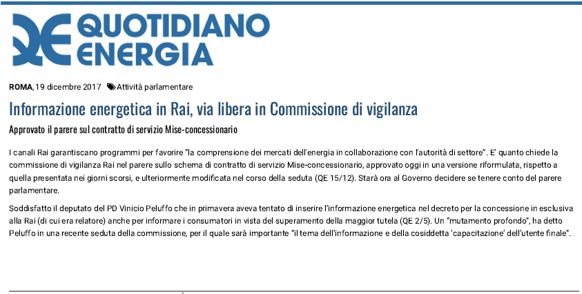 Informazione energetica in Rai, via libera in commissione di Vigilanza 19 Dic, 2017 Attività parlamentare · Dicono di me · Energia · Rai Nessun commento